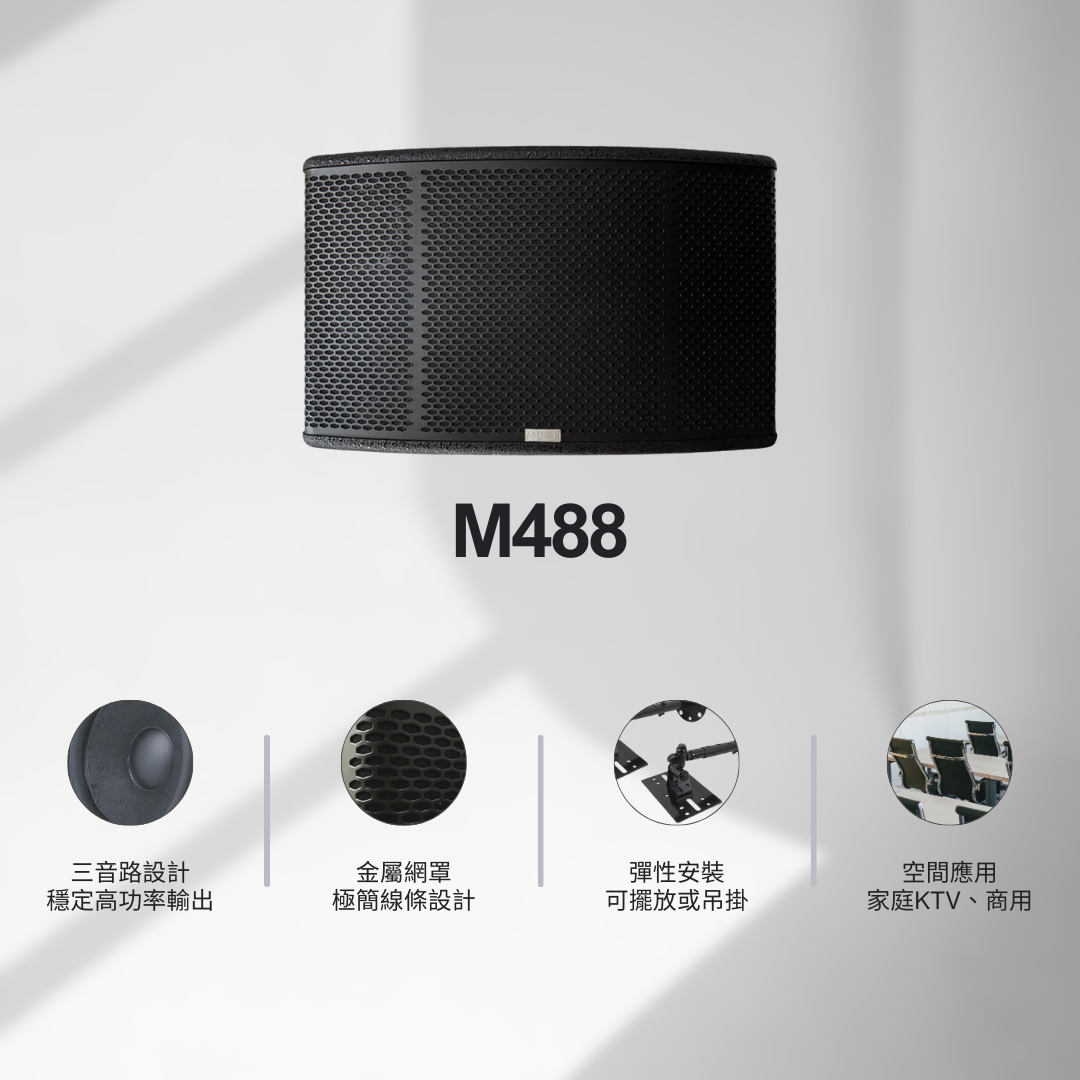 - 在輸出與驅動方面,M488具備充足功率與穩定放大設計,即使在較高音量下,聲音仍能維持良好密度與清晰輪廓,不易產生失真或壓迫感,適合中大型空間使用。