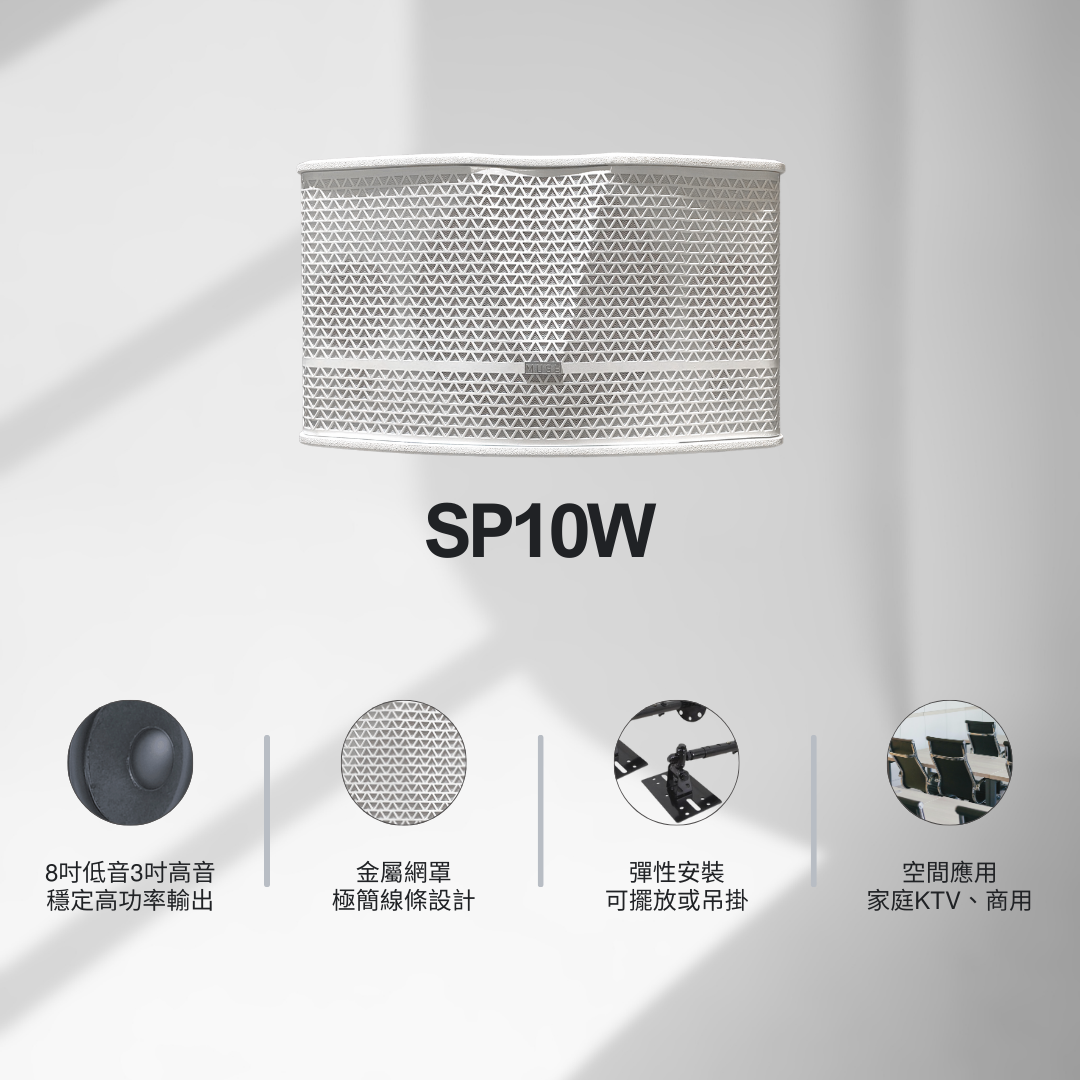 - 聲音配置上,SP10 採用 300W 額定功率與 93dB 高靈敏度設計,使聲音在不同音量區間都能維持穩定密度與清晰層次。